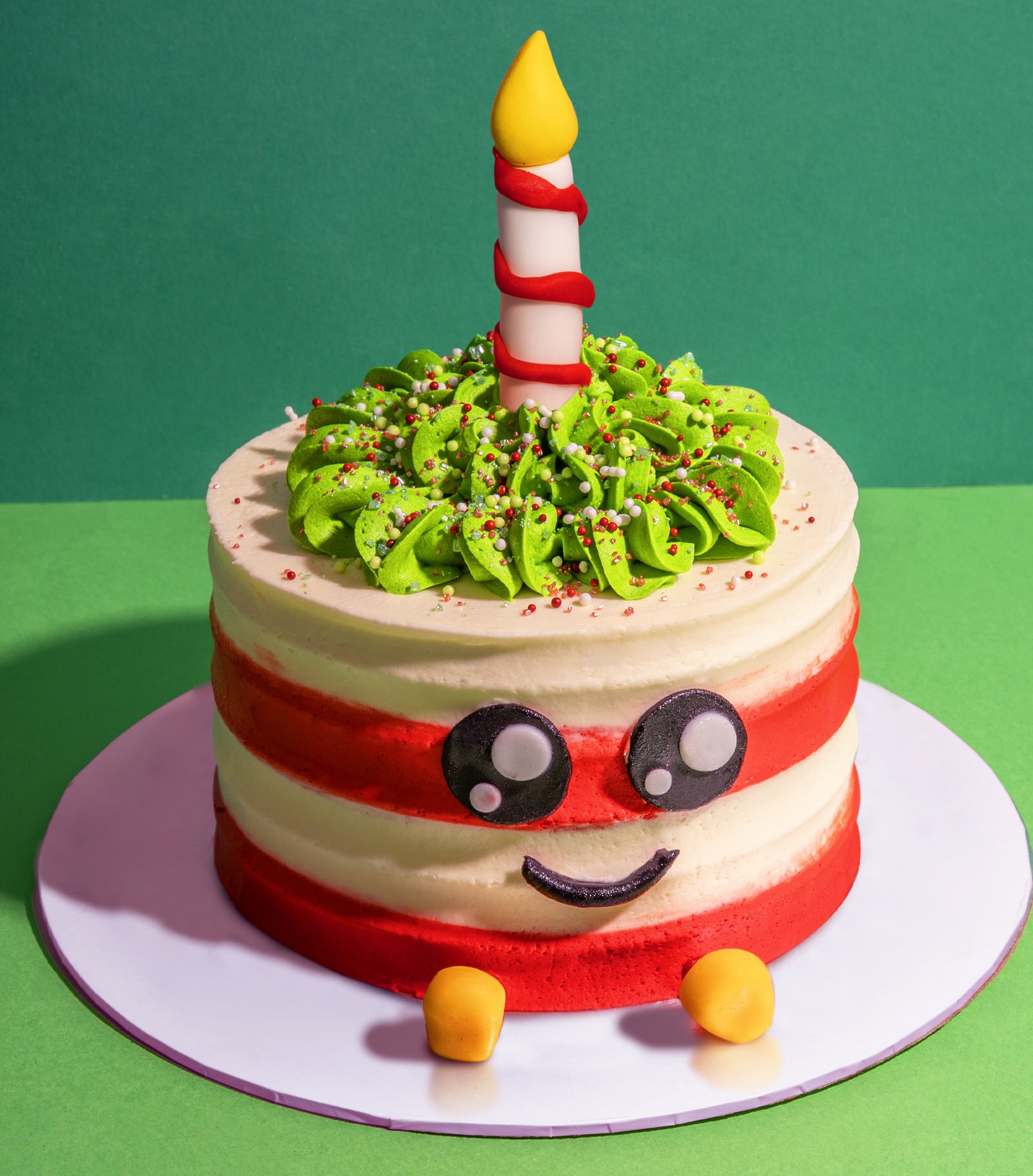 Decoration: Decorated with red and white striped frosting, handmade sugarpaste feet and cartoony candle and face. Finished with green buttercream 'Christmas tree" piping and festive sprinkles. A handcrafted Christmas masterpiece.