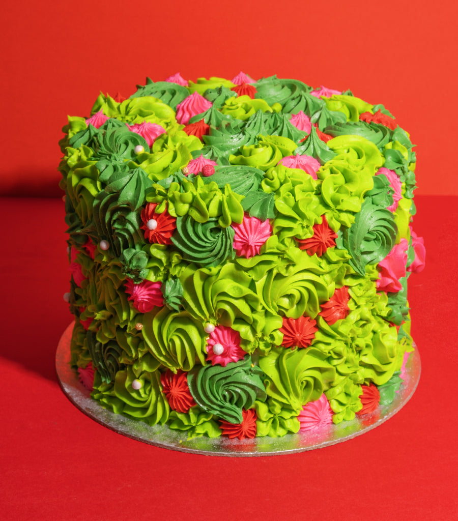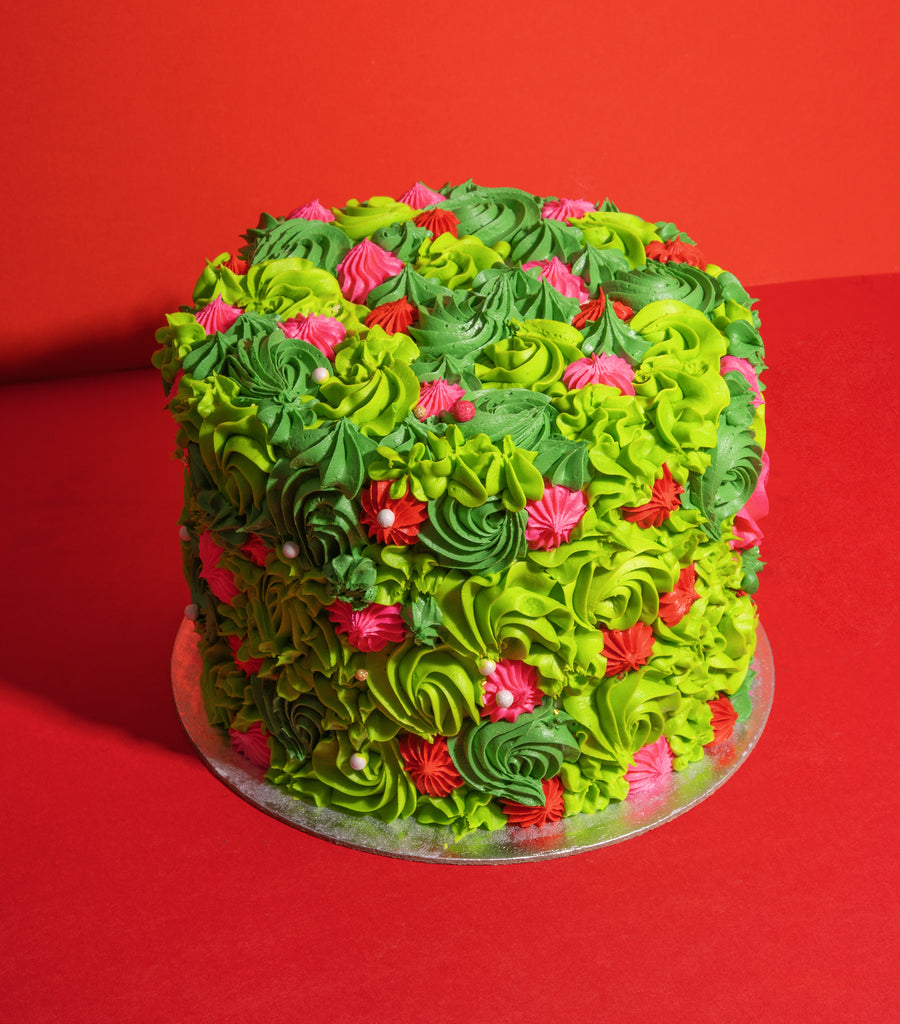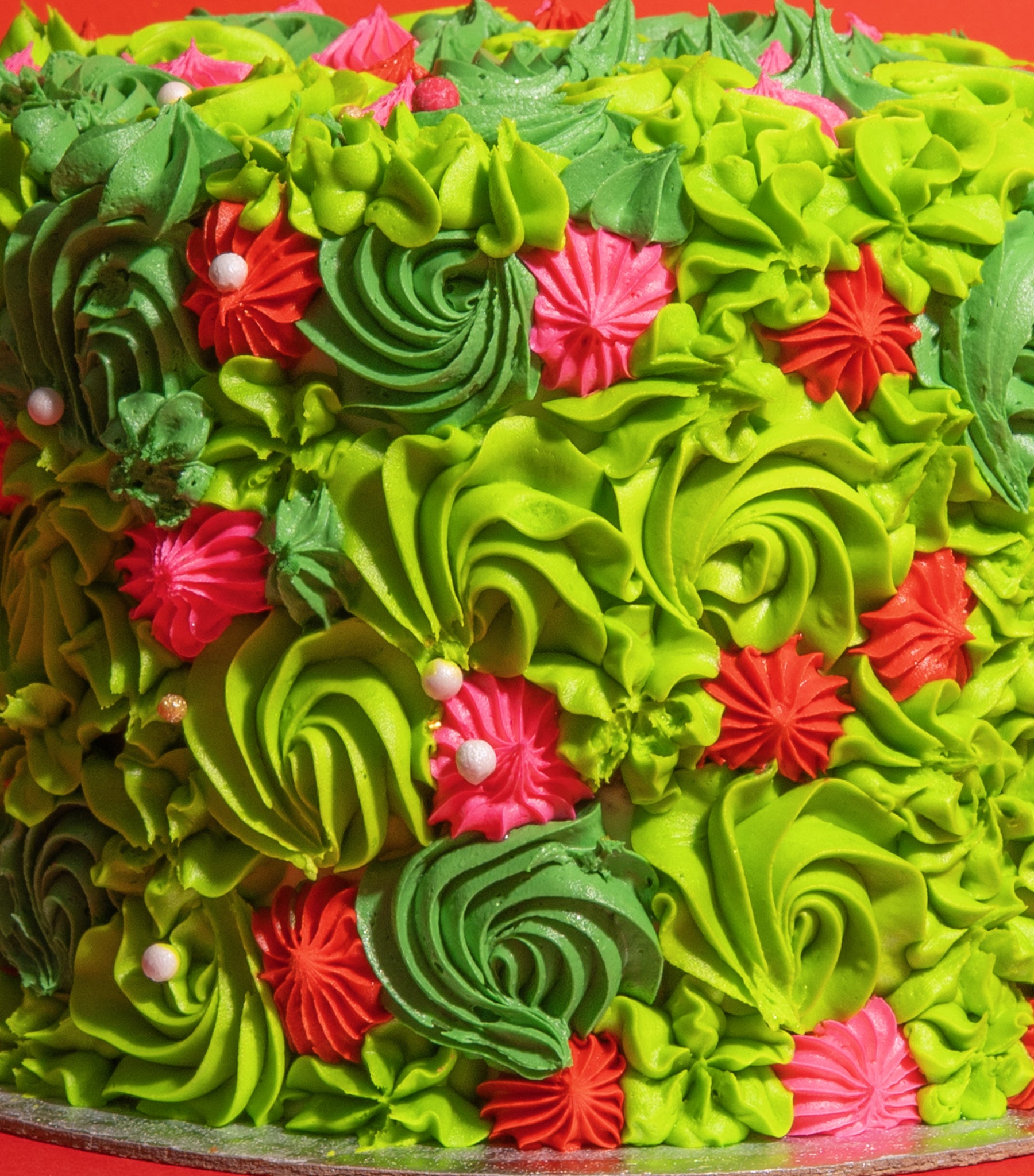 Decoration: Swirls of green buttercream "branches" with red and gold accents and glitter. All hand-piped by our amazing cake decorators.