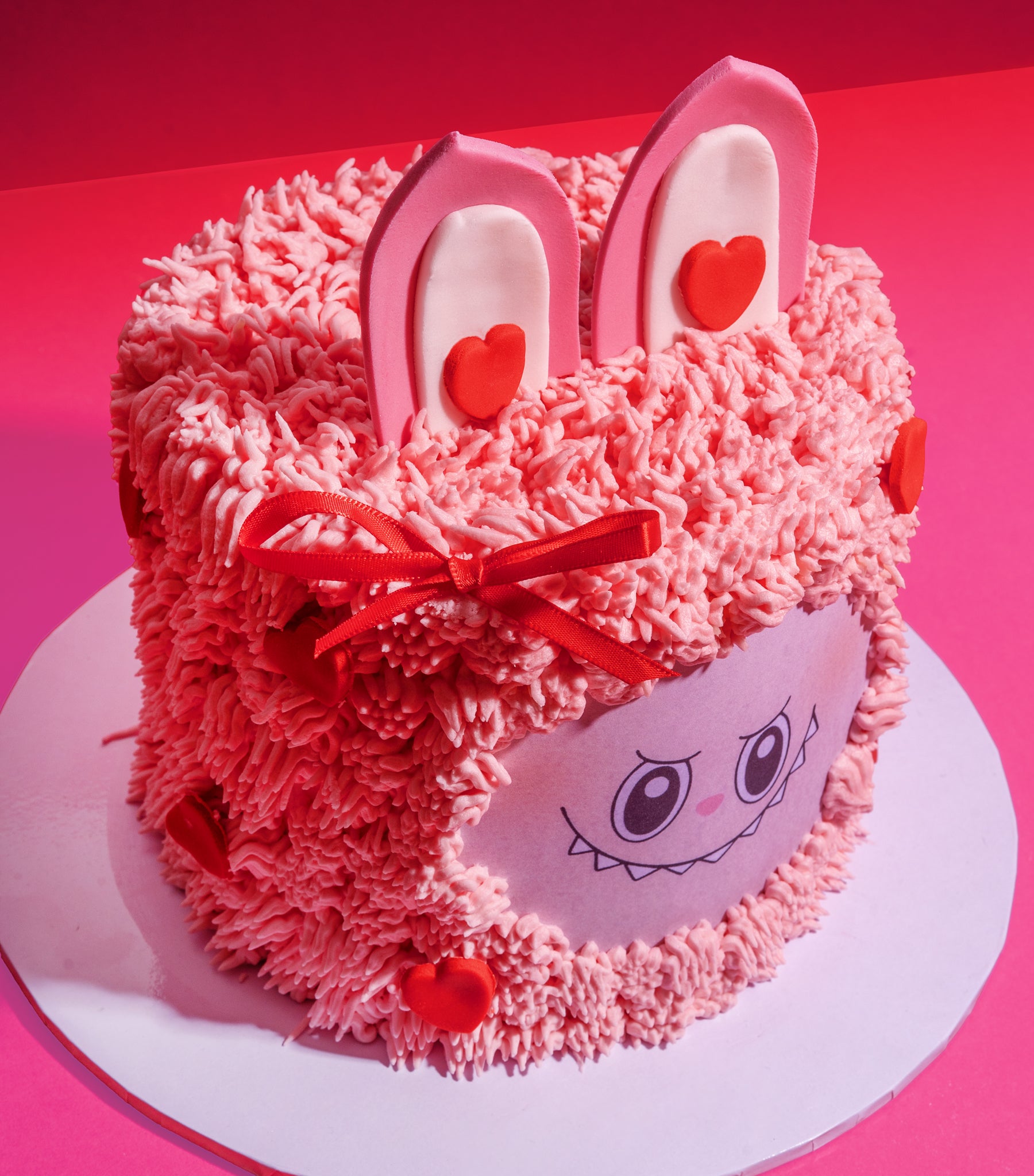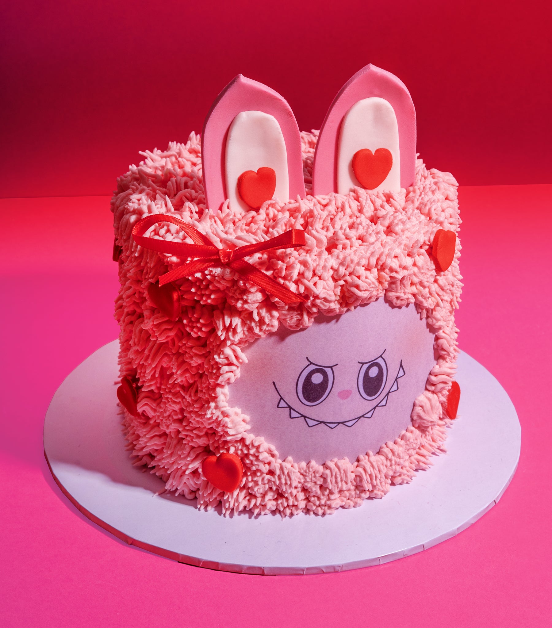 Decoration: Decorated with strands off hand piped buttercream 'fur', handmade ears, that loveable Labubu Face, and finished with handmade Valentine's Day hearts and a red bow.