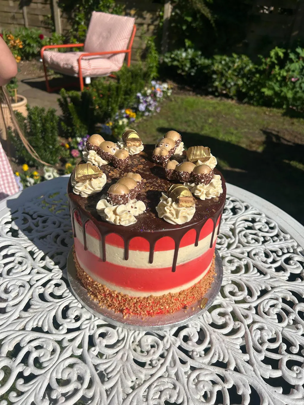 Decoration: Caramelised hazelnut praline, a decadent Belgian chocolate drip, a sprinkling of feuilletine, golden Bueno bar chunks and finally, if that’s not enough, Bueno Hippo’s!