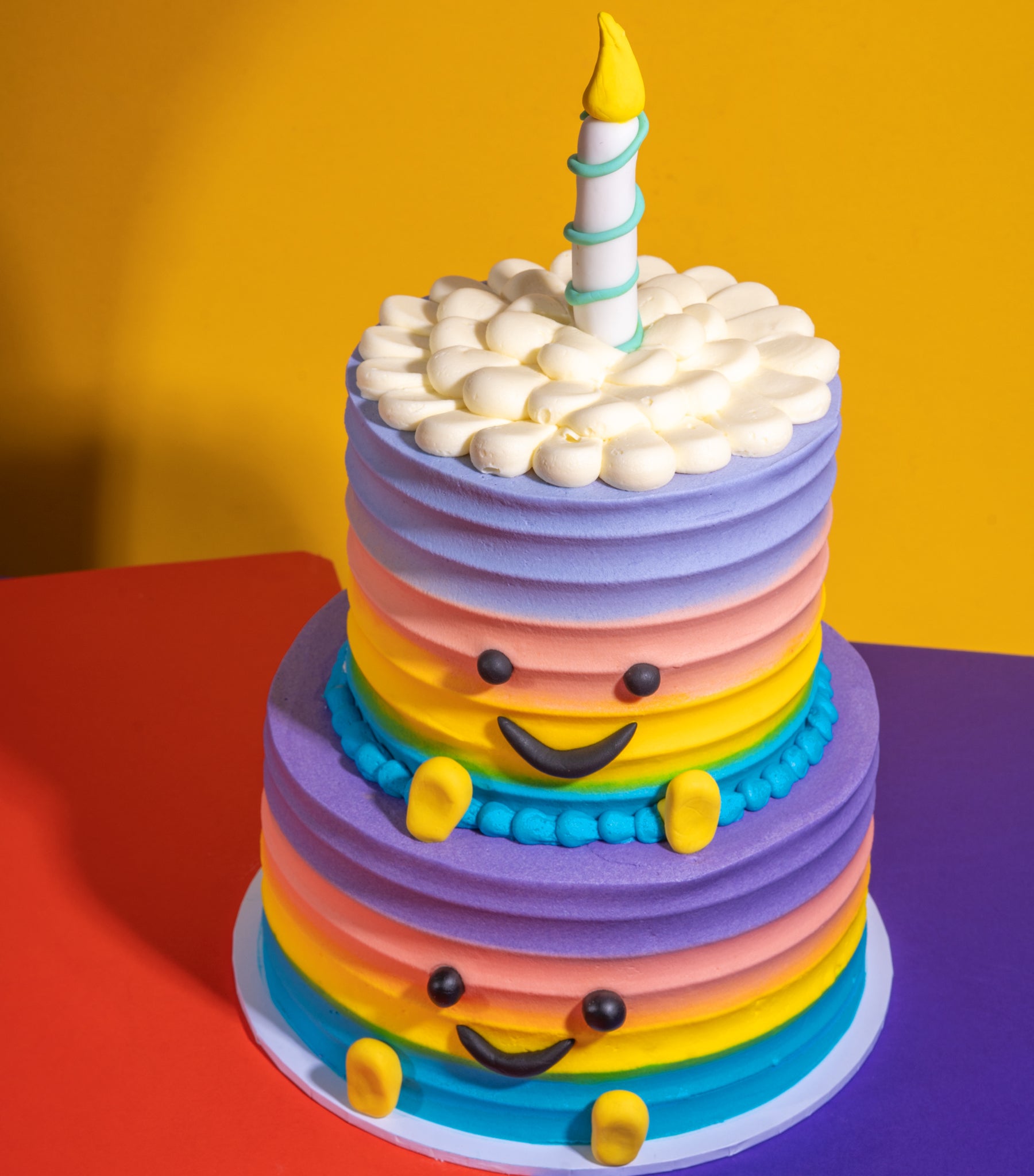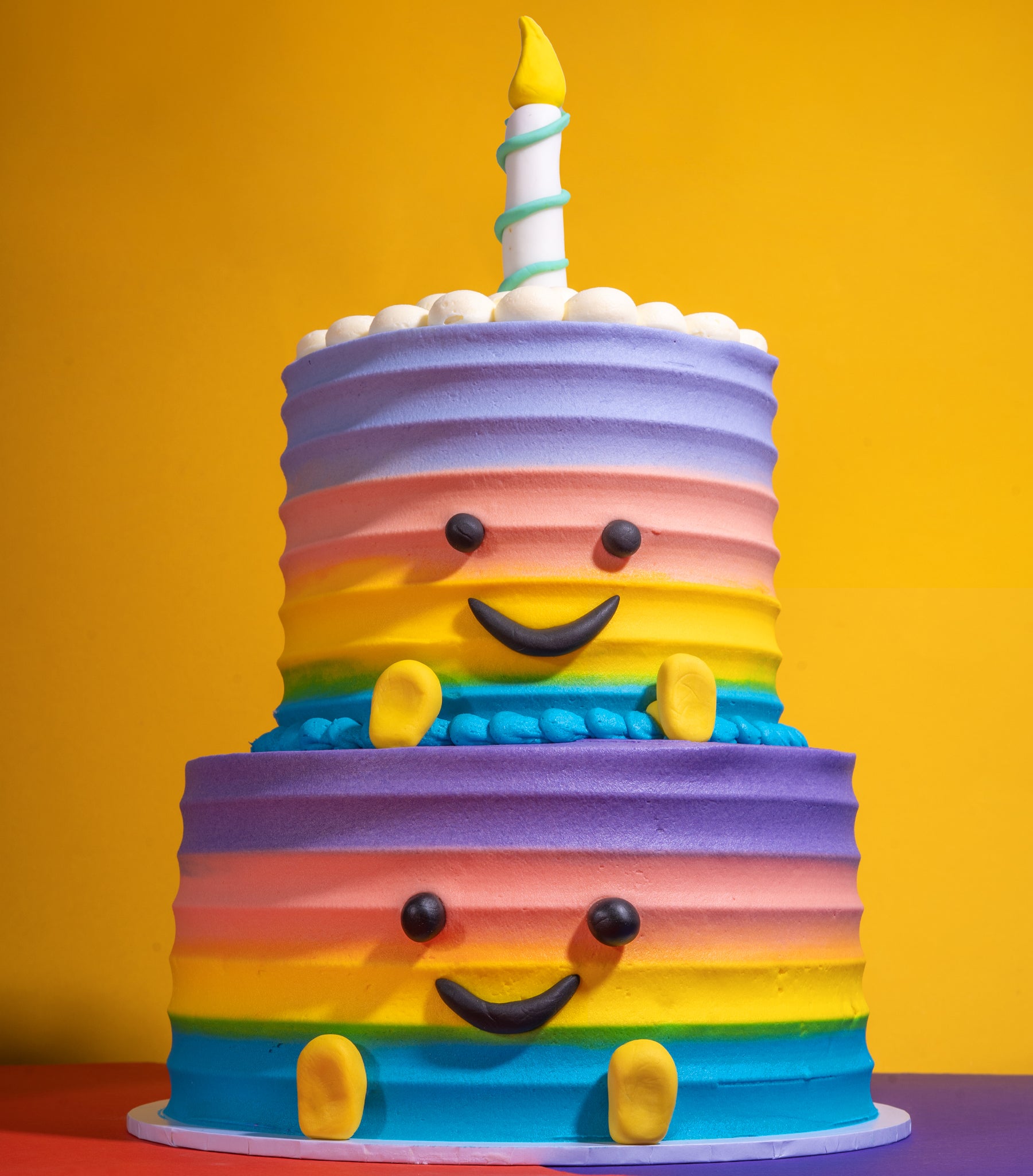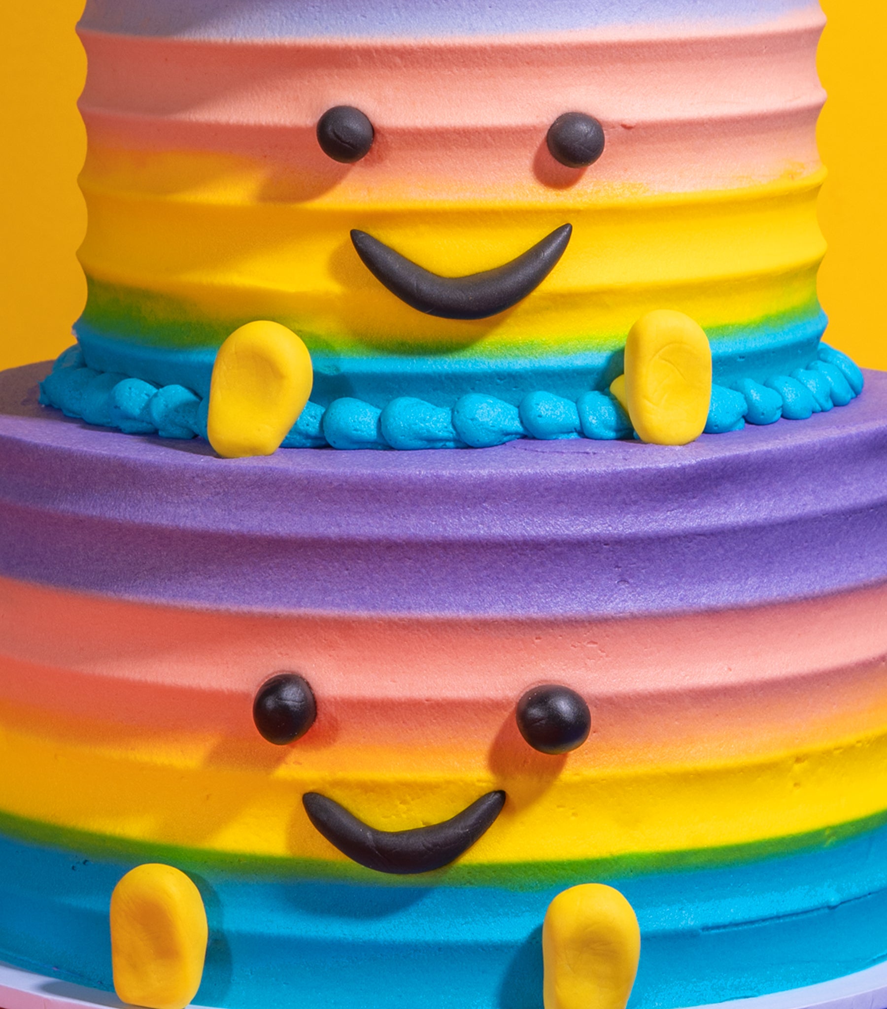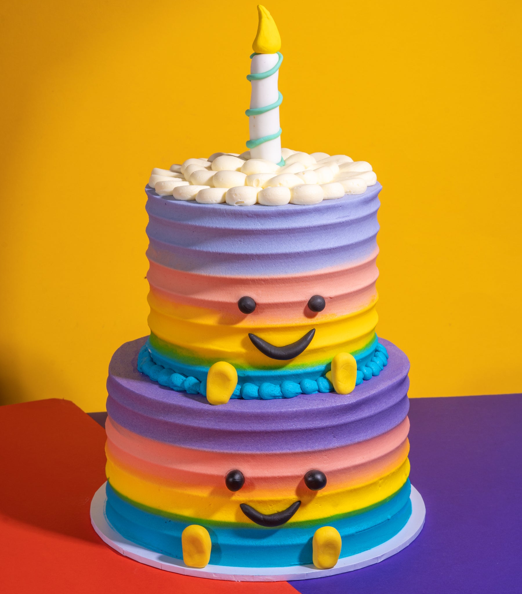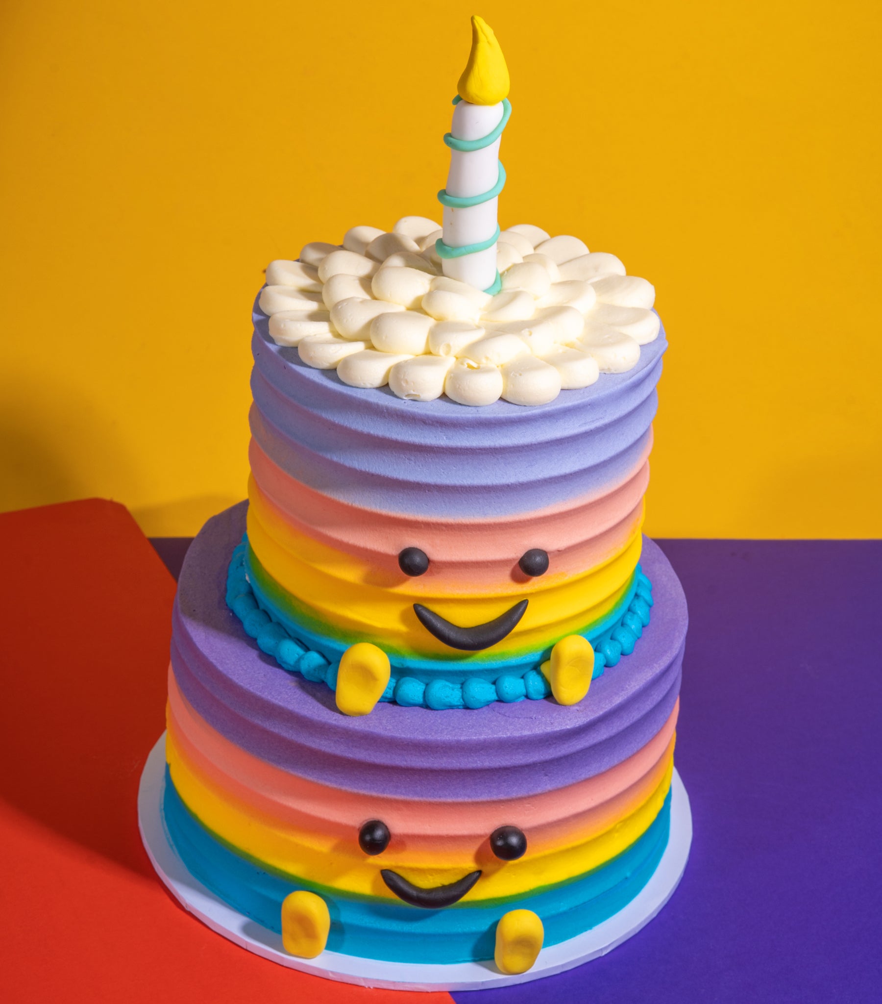 Decoration: Beautifully hand decorated with stripes of rainbow frosting, handmade sugarpaste feet, cartoon candle and face. Finished with perfectly piped buttercream details across both tiers.