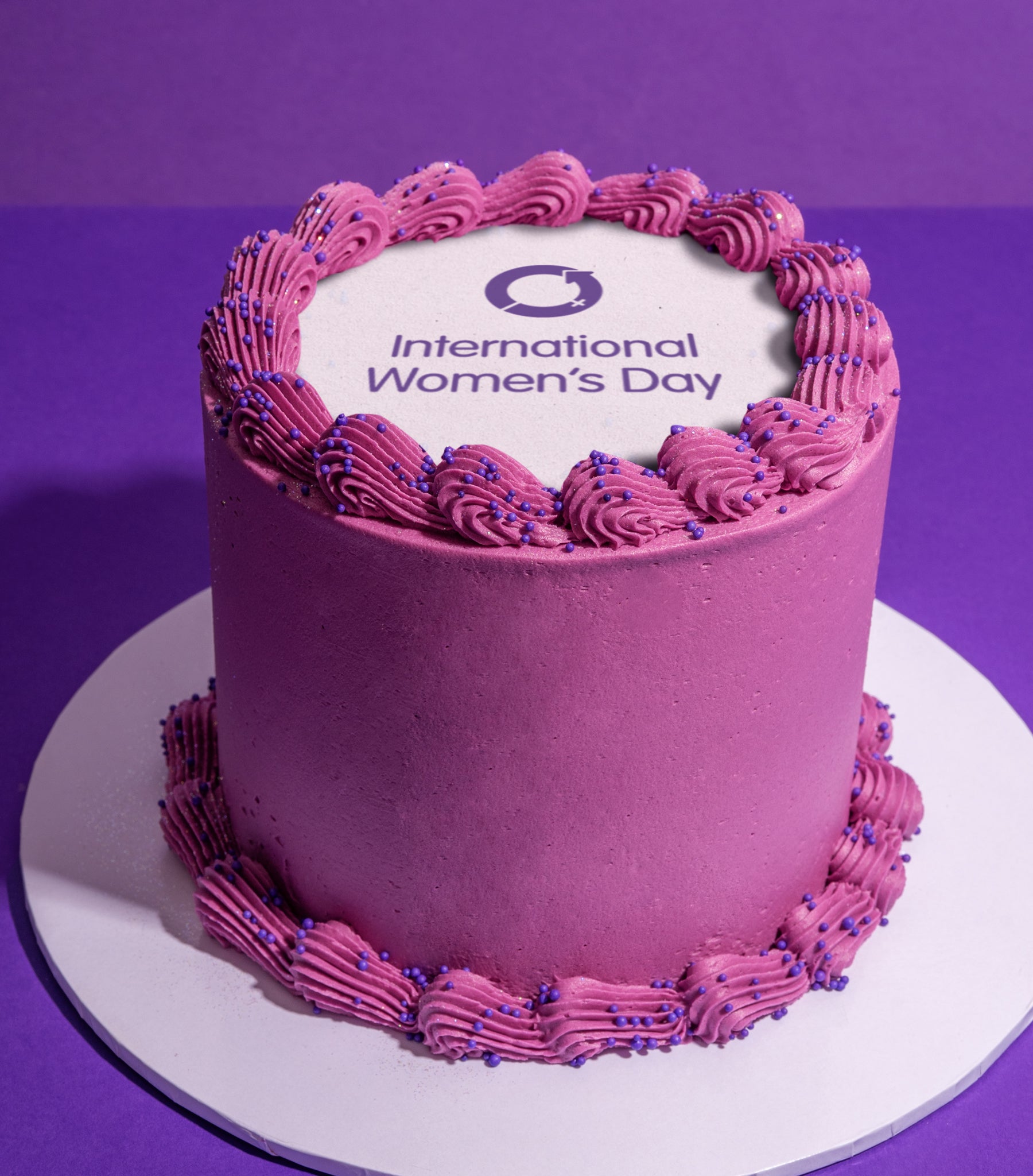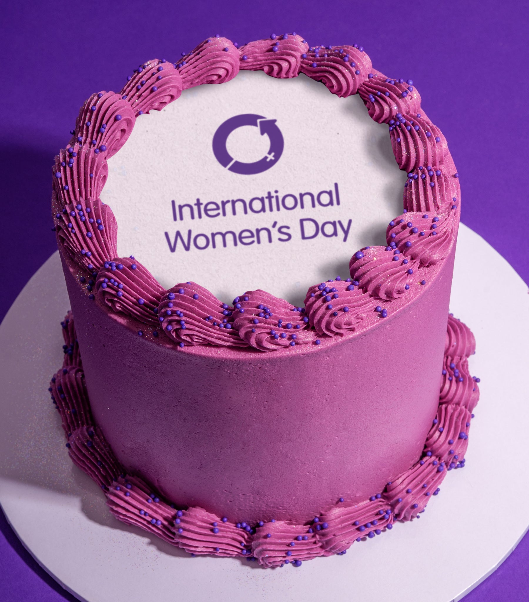 Decoration: Our International Women's Day Cake is decorated with hand-piped buttercream edging, purple sprinkles, and finished with a printed edible ink IWD logo plaque.