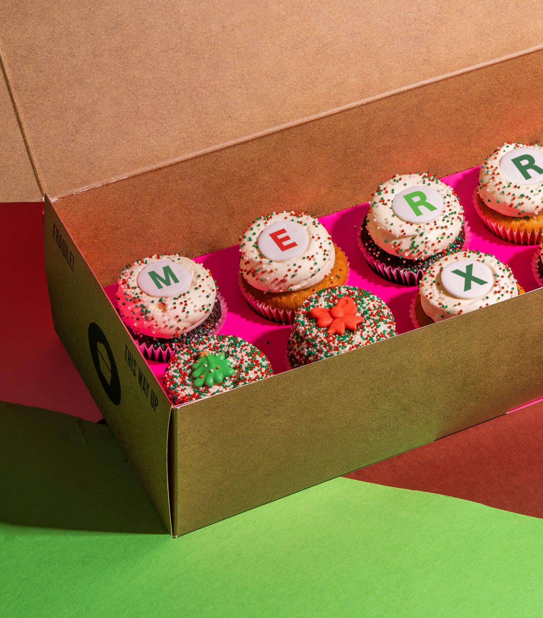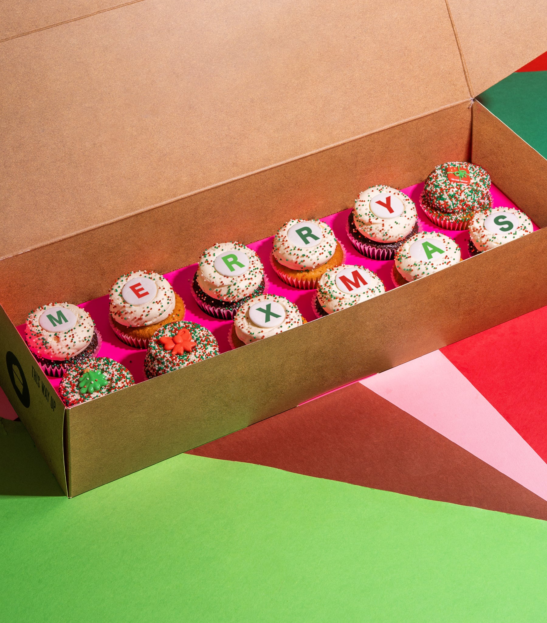 This year we've made Christmas gifting in London easy. A box of luxurious handmade festive cupcakes that does the talking for you - Meet our Merry Christmas Gifting Cupcake box. A dozen delectable freshly baked, festive-sprinkled Flavourtown cupcakes that spell out 'Merry Xmas'