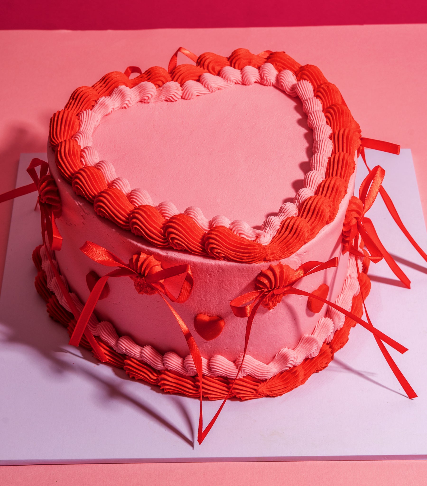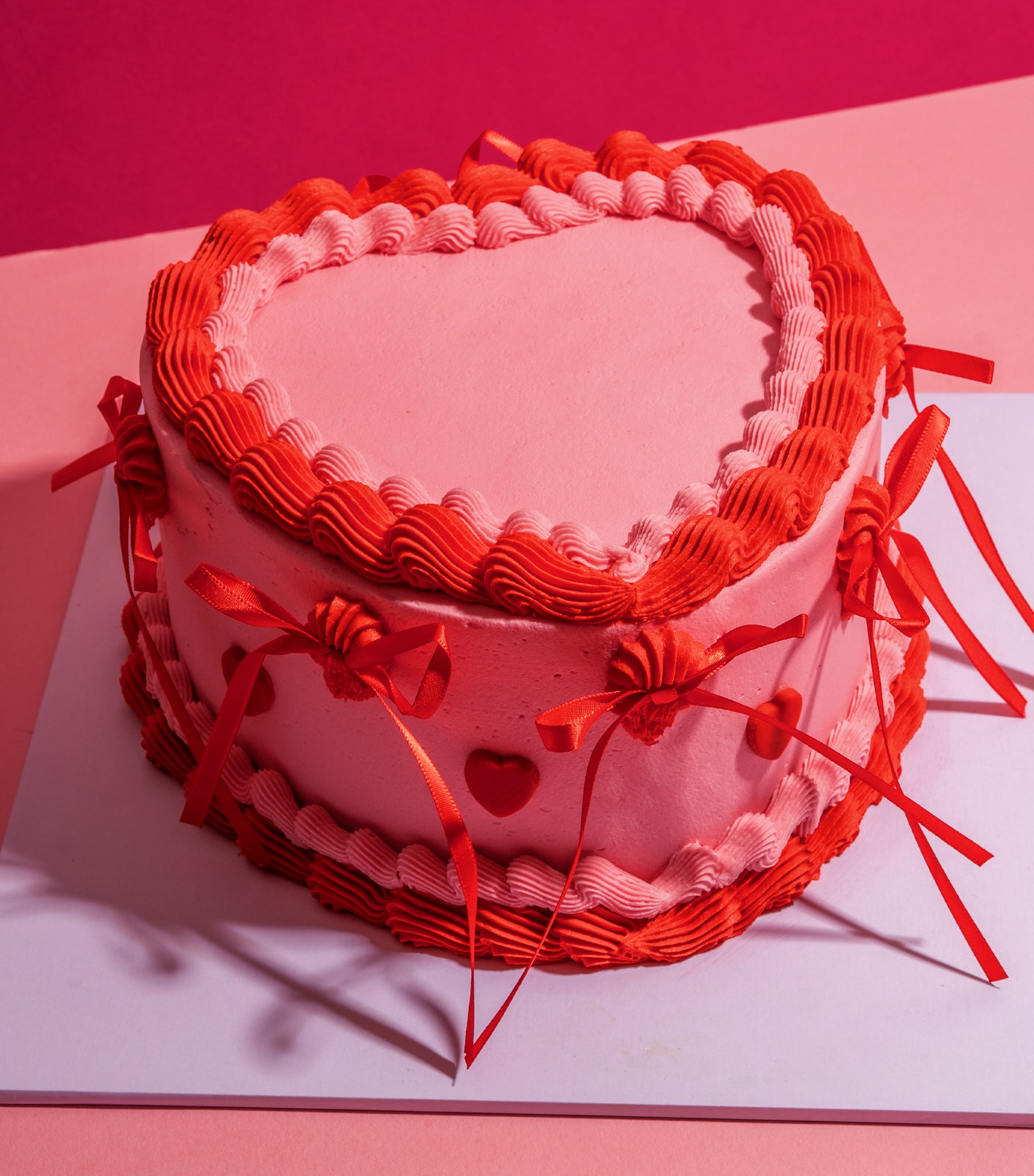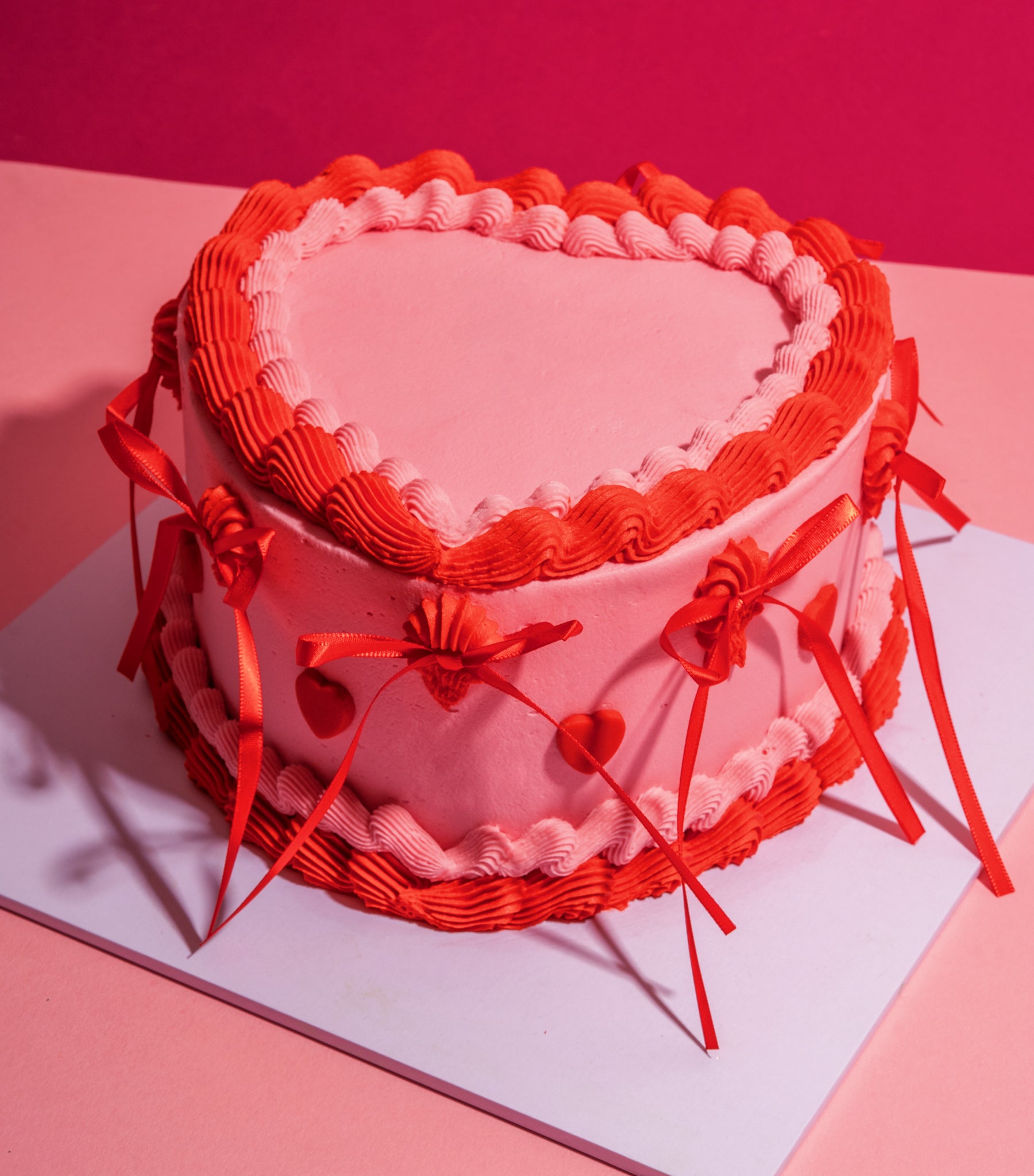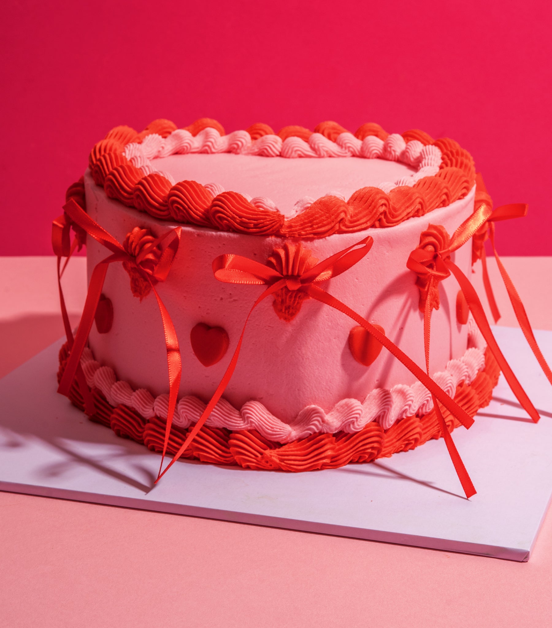 Decoration: Swoops and vintage swirls of pink and red vanilla buttercream frosting, adorned with red bows. Finished with handmade red mini sugarpaste hearts.