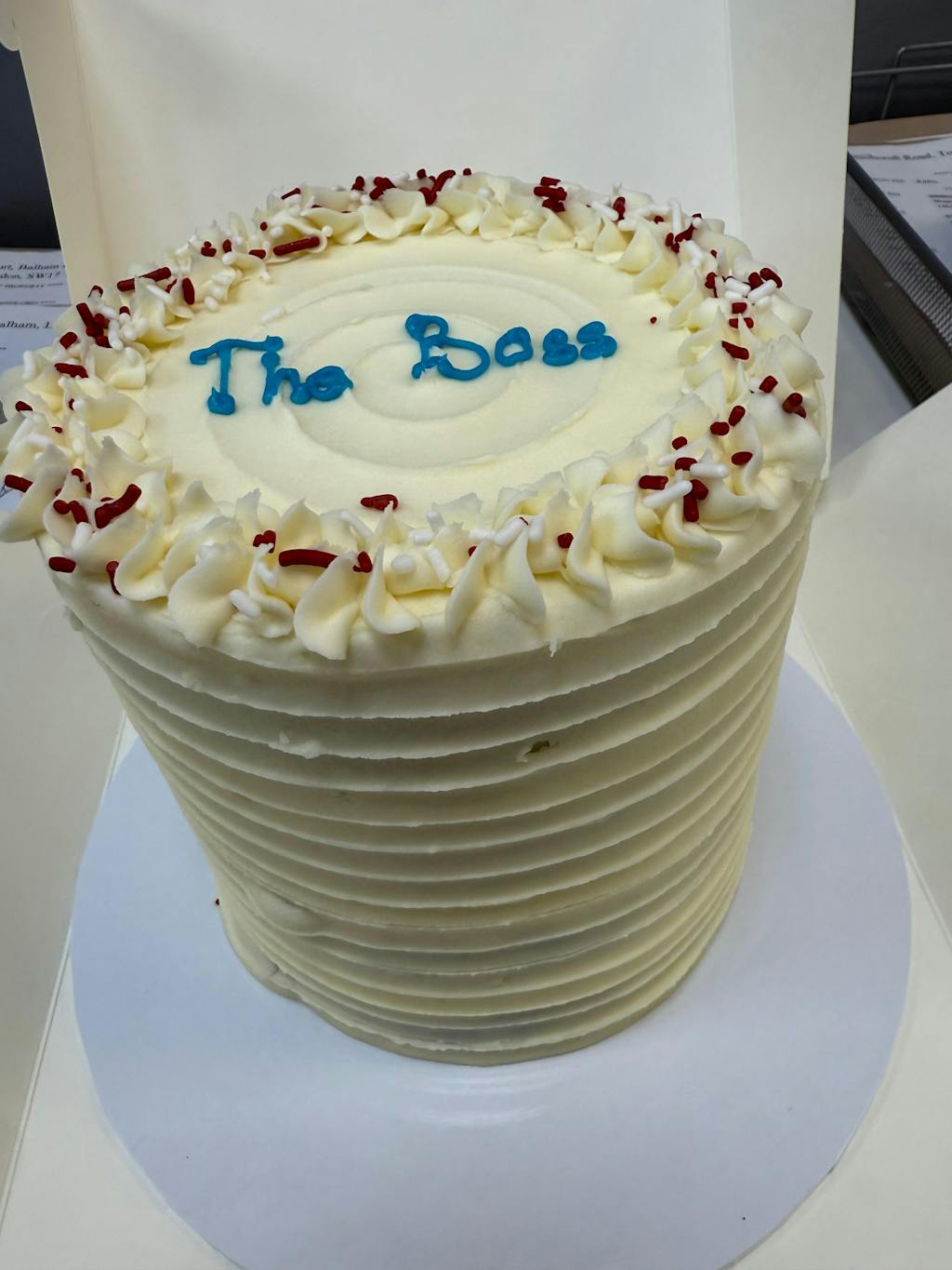 Sponge: Four layers of plant-based Red Velvet sponge with a hint of Madagascan vanilla and a hint of Belgian chocolate.