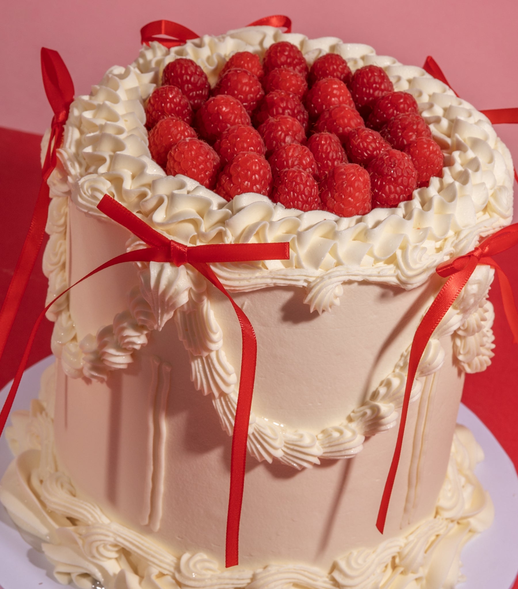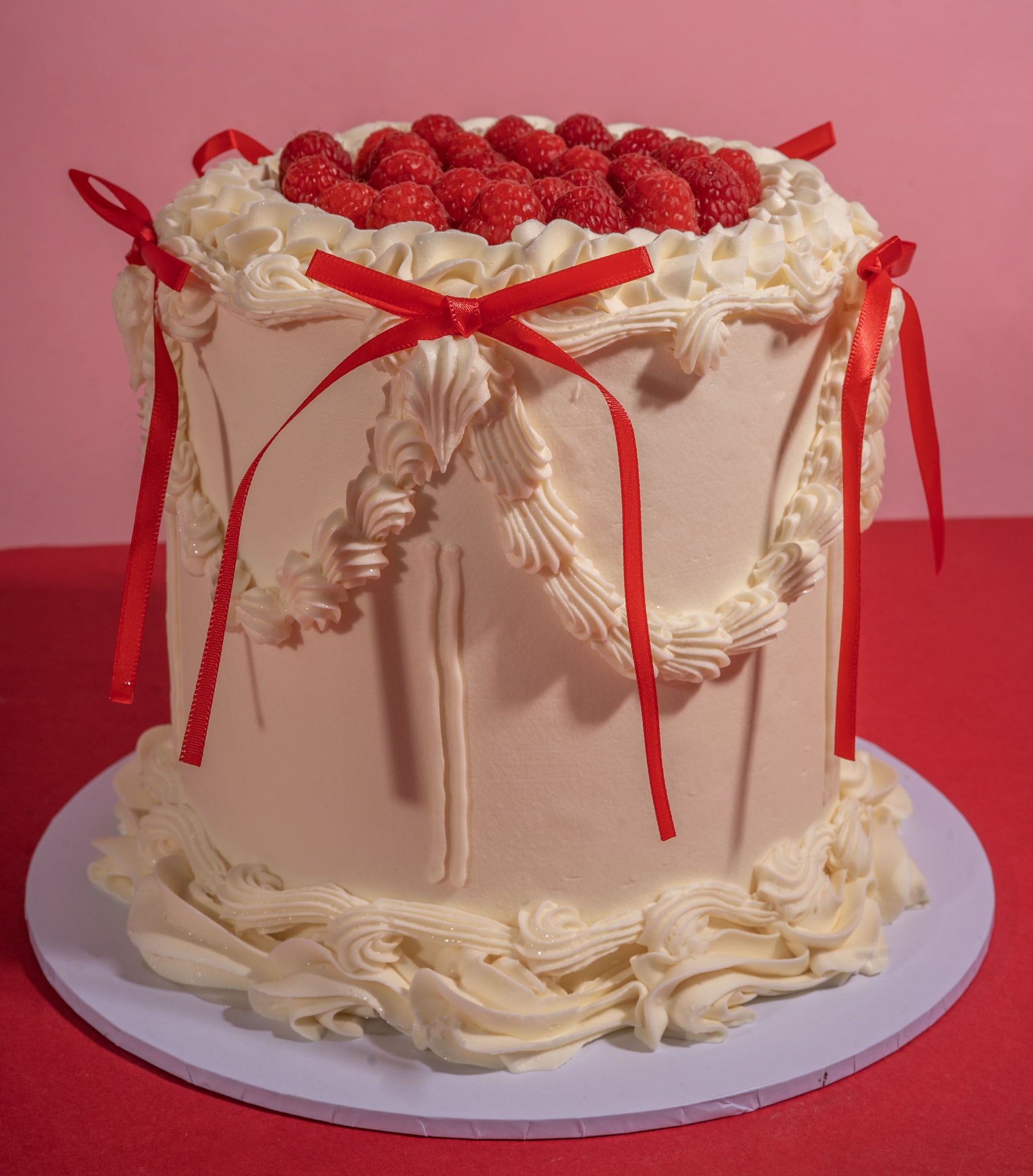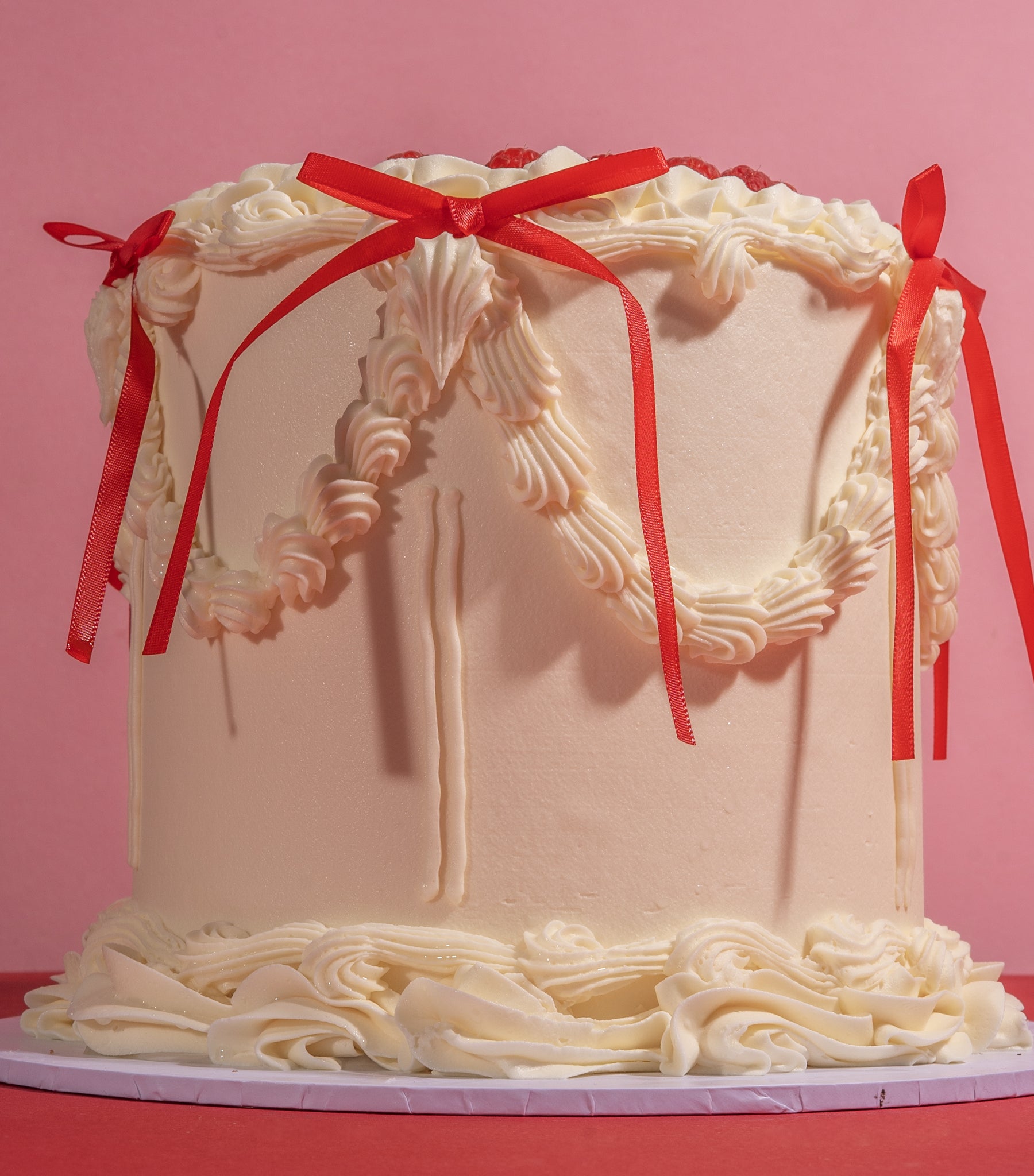 Decoration: Expertly decorated by our amazing cake artists. *Lambeth-style buttercream borders. *Intricate piped swags, ruffles and handcrafted details. *Red ribbon bows. *Finished with juice fresh raspberries.