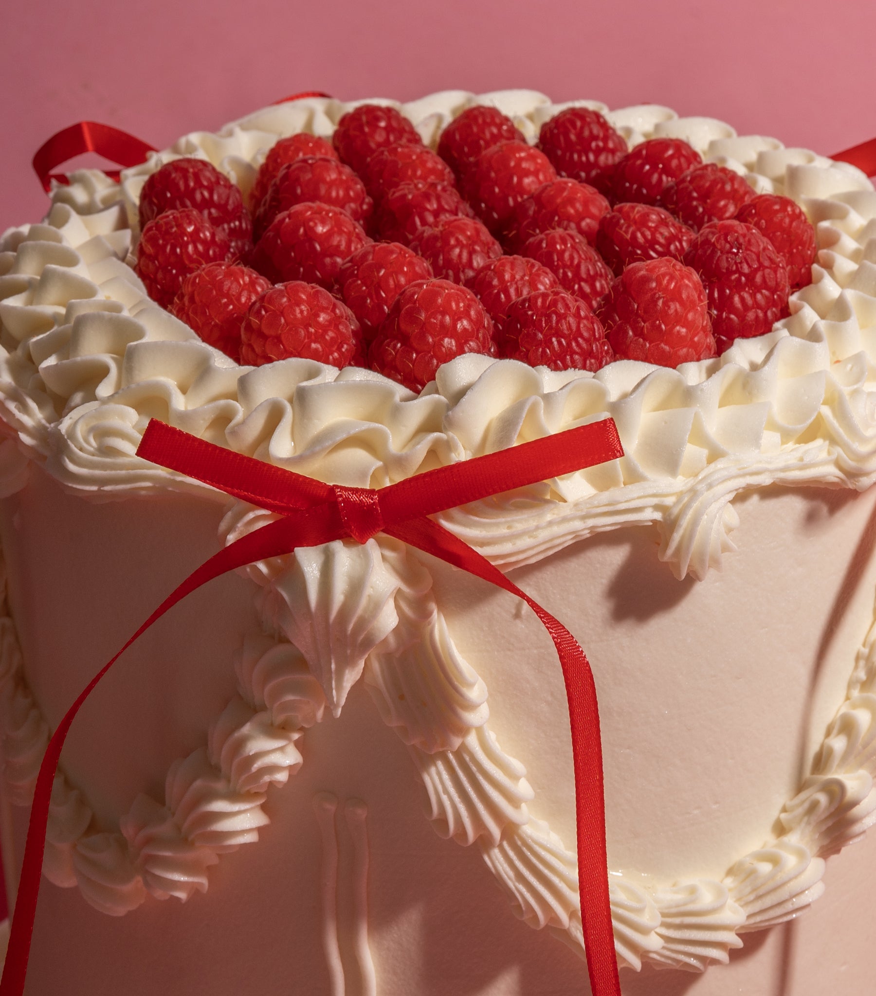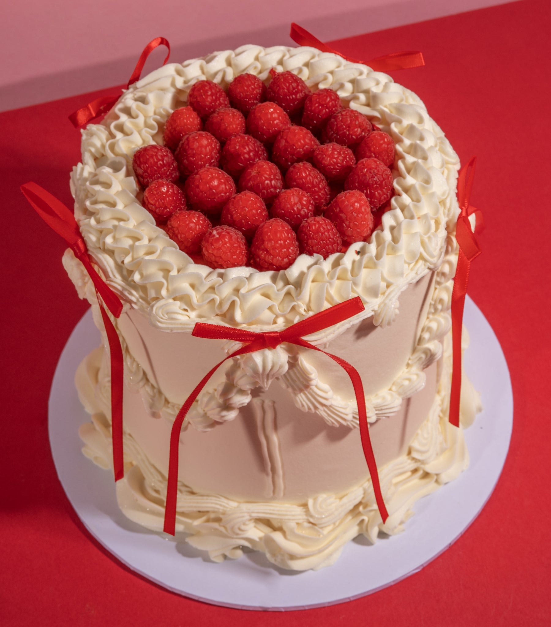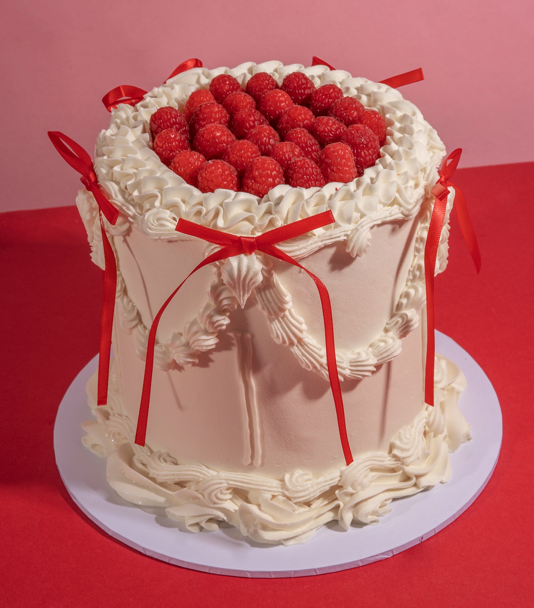 Decoration: Expertly decorated by our amazing cake artists. *Lambeth-style buttercream borders. *Intricate piped swags, ruffles and handcrafted details. *Red ribbon bows. *Finished with juice fresh raspberries.